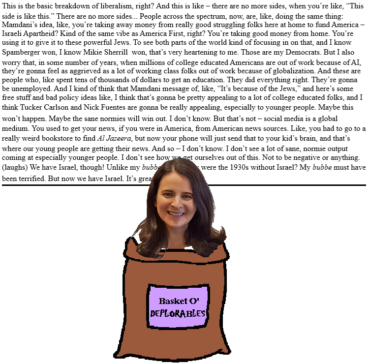 The massaging of her recent messaging starts with the conflation of anti-Zionism and anti-Judaism. Ooh. Aah. Stroke me there! Hurwitz misrepresents New York City Mayor-elect Zohran Mamdani's position in this way to lump him together with actual Jew haters like Nick Fuentes and Tucker Carlson, the better to dismiss his criticisms of Israel's actions in Gaza. Aah - no, don't stop! It's just getting good. Hurwitz' brand of "liberalism" apparently supports an Apartheid state that commits war crimes and quite possibly genocide; all who oppose that must be Jew-hating fascists.