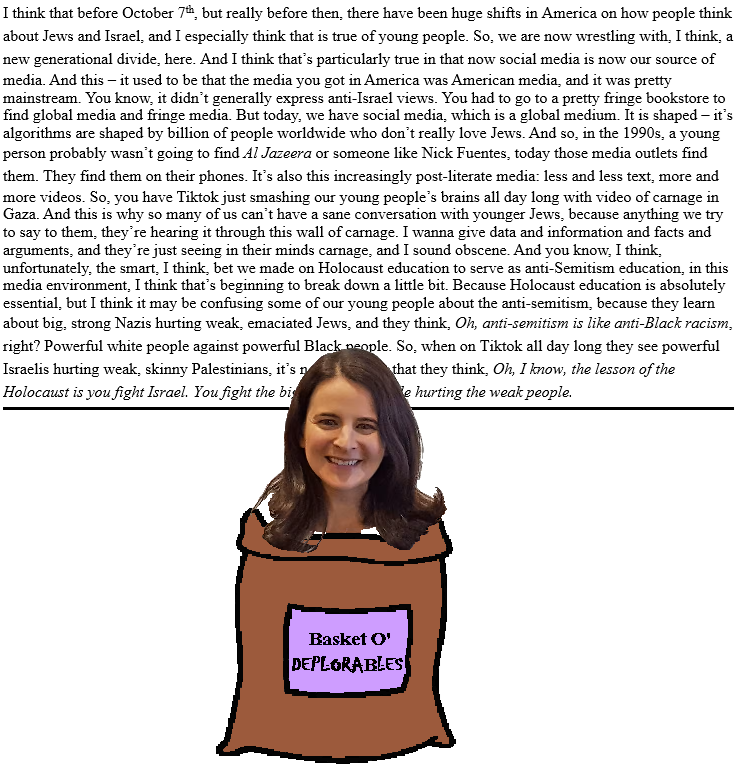 Unfortunately for Hurwitz, it's hard to make the argument that Jews (roughly 30 per cent of whom oppose Israel's actions in Gaza) are Jew-hating fascists (the dissonance might wake information from its reverie), so she reaches for the argument that Jews who oppose what Israel is doing in Gaza have been radicalized by the Internet. Radicalized by the internet. Radicalized. By the internet. Is it just me, or is there something self-defeating about somebody railing against videos on social media in a video most people will only see on social media? I would say it was ironic, but I heard somewhere we live in a post-literate society, so anybody reading this would probably think I was talking about a vitamin.