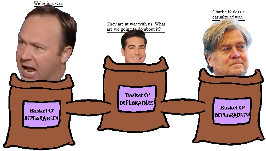 The death of Charlie Kirk has caused the right wing bloviasphere to say the quiet part out loud: the race war that the fringe of the right has been looking forward to for years is now part of the mainstream right's discourse. (While the left still talks about working with their friends across the aisle - warfare doesn't get more asymmetrical!)