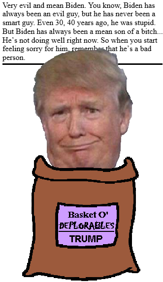 What brought this rant from President Trump on? Did Joe Biden poison his dog? Did Joe Biden shut down environmental watchdog organizations, allowing corporations to get away with poisoning his air and water? Did Joe Biden say mean things about him on Fifth Avenue?
