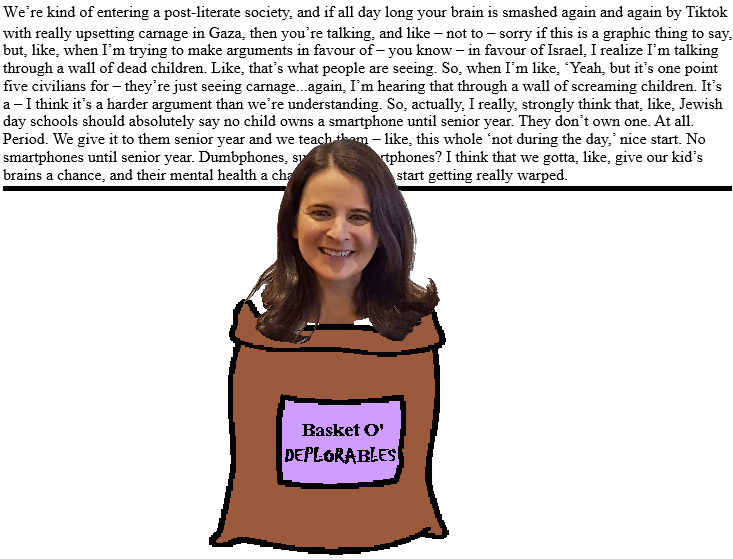 Unfortunately for Hurwitz, it's hard to make the argument that Jews (roughly 30 per cent of whom oppose Israel's actions in Gaza) are Jew-hating fascists (the dissonance might wake information from its reverie), so she reaches for the argument that Jews who oppose what Israel is doing in Gaza have been radicalized by the Internet. Radicalized by the internet. Radicalized. By the internet. Is it just me, or is there something self-defeating about somebody railing against videos on social media in a video most people will only see on social media? I would say it was ironic, but I heard somewhere we live in a post-literate society, so anybody reading this would probably think I was talking about a vitamin.