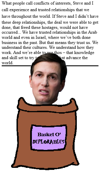 But no, Kushner felt the need to publicly justify his corruption. Redefining conflicts of interest as having "experience and trusted relationships" throughout the world is like claiming that the pig you just put lipstick on is a Miss World pageant contender. You could enter the pig in the competition, but that doesn't mean anybody would fantasize about marrying it.