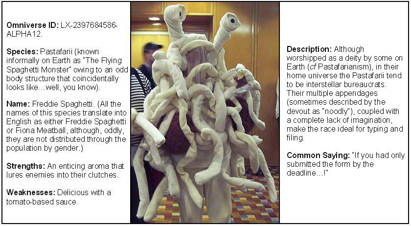 The omniverse is a vast place, an infinity of infinities, with a wide variety of colourful life forms. Why, in the last week alone, Alternate Reality News Service reporters have encountered: a “smart” house that was nominated for a Nobel Prize for physics; a race of six foot tall mutant hamsters that powered a vast, peaceful galactic civilization by harnessing the exercise wheels in their sleeping quarters to batteries, and; a race of half donkey, half spider, all dictionary creatures that spun a web of terror across a dozen star systems.