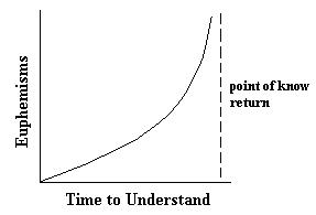It is not possible to stay ahead of the curve forever, though. As you can see from Figure 1, the time between the introduction of a new euphemism and the point at which the public uncovers its ultimate meaning decreases the greater the number of euphemisms one employs. The curve eventually approaches the "Euphemism Curve Asymptote," commonly referred to as the "point of know return."
