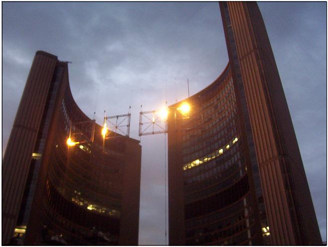 Then the deep rumbling music started, and a door opened up and the aliens walked out of the mist and...okay, this is City Hall with a fancy light show. Ominous image. Somewhere, a mayor is weeping.