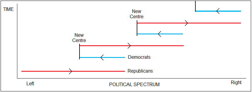 There is a fundamental imbalance in the way American political parties govern when they are given power. The Republicans campaign from the right and govern from the far right. Democrats, on the other hand, campaign from the left and govern from the centre. As you can see from the chart below, this has a tendency to drag the centre towards the right.
