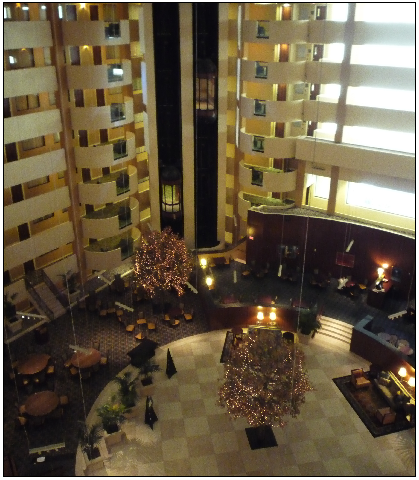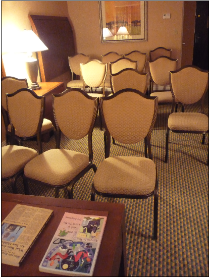 What if they gave a reading and no one showed up? It would look something like this. (Actually, I had one and one eighths audience members, so the story had a happy ending. Well, it would have if the guy in the atrium - remember the atrium? I told you to pay attention to the atrium - didn't use a microphone to...call people to their tables? Call out Bingo numbers? Call the faithful to their just reward? It wasn't clear what he was doing, but it clearly was loud!)
