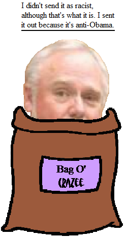 Okay, emailing racist jokes to a few of your closest friends about the president that equate interracial sex with bestiality isn't enough to get you into the Bag of Crazy. Racist? By definition. Tacky? Hell, yes. Crazy? Not by current definitions. Especially those that can be applied to Republicans.