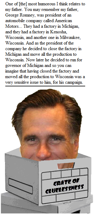 And, who better to inaugurate the Crate of Cluelessness than Mitt Romney, whose every utterance cries out for a month of remedial life classes?