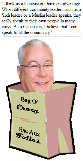 Welcome home, Ron Leech, Wildrose Party candidate for Alberta's Calgary Greenway riding. I was considering choosing his clever witticism about gays (to whit: "To affirm homosexuality is to distort the image of god, to insult the nature and being of god."), but, you know, nothing says Crazy quit so much as an ill-considered statement of racial superiority.