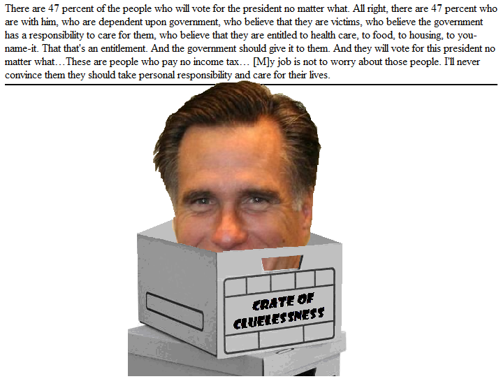 What makes this statement so terrible? It's not that the Mittwit earned so much of his wealth the old-fashioned way (by inheriting it - don't tell me you didn't see that one coming: it's been around since the 1800s, coincidentally the time the Republicans want to take us back to!). It's not that his company is responsible for so many Americans collecting government benefits because it shipped their jobs to other countries. It's not the equation of Democrats with Welfare queens (in fact, people on public assistance are more likely to vote Republican). IT'S ALL OF THESE THINGS, AND SO MUCH MORE!