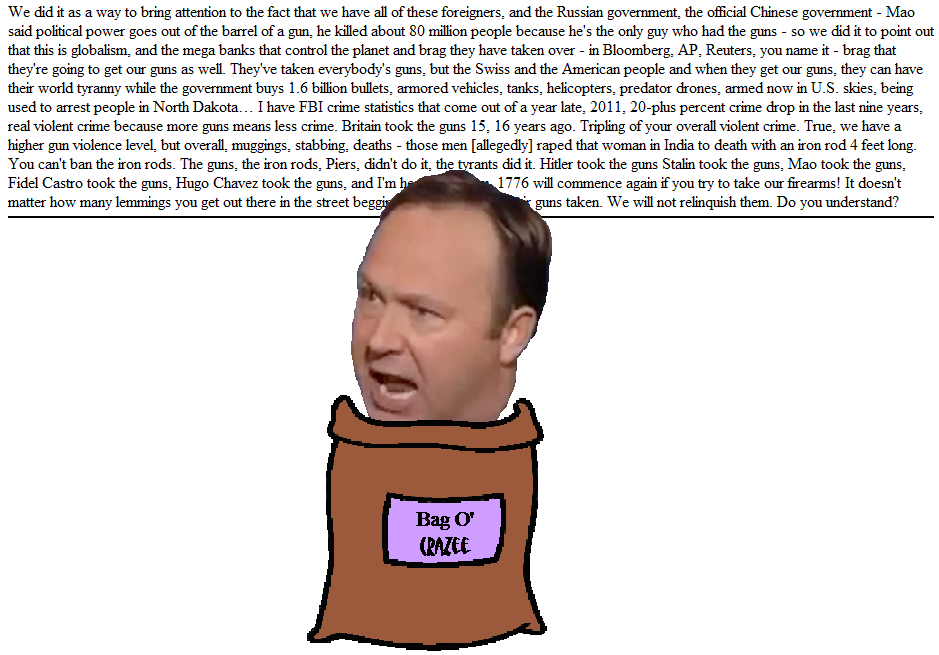 Of course, although it may be large, even one of those skulls is not infinite, and the crazy can create increasing pressure until it eventually blows, forcing everybody in the vicinity to flee the devastation in terror. Talk radio host Alex Jones had just such a Vesuvian eruption in a debate with Piers Morgan on the issue of gun control on CNN.