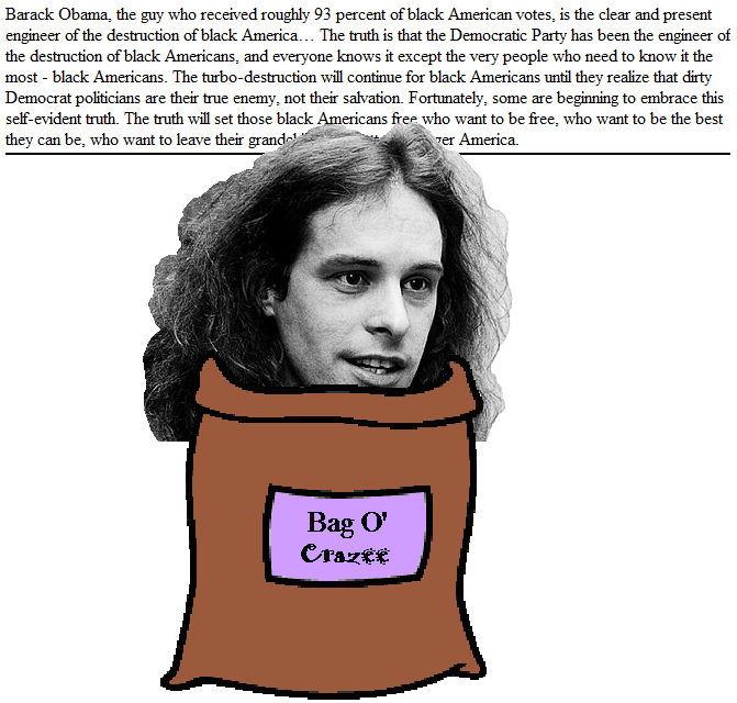 It's bad enough that a white man presumes to tell black people what's in their best interests, but that's a time-honoured tradition. What makes this statement crazy is the idea that lecturing blacks will somehow make more of them want to vote for right wing candidates. Are Republicans shooting for losing 100 per cent of the black vote in the next election cycle?