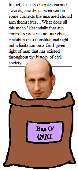 I must admit, I kind of like the image of Jesus mowing down the moneylenders in the temple with an Uzi. None of that wimpy beating our automatic weapons into plowshares here, thank god! And, when the Romans came to take him to be crucified, Jesus should have barricaded himself in a compound with handguns, semi-automatic rifles, grenade launchers, anti-aircraft guns and any other weapons the NRA would happily make available to him. Of course, the meaning of Jesus' life would have changed a little in this telling...
