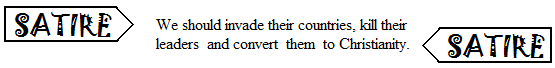 Even if the pages of a work are lined with arrows down either side of text, indicating satire (which they rarely are, since this would add substantially to the number of pages the work takes up, which would increase the cost of publishing it), the reader used to the speed of digital communications may quickly learn to ignore them, leaving such readers open to once again misinterpreting a text. The latest effort by publishers to combat this problem is to embed warnings of satire directly into the works themselves. This looks very much like this:
