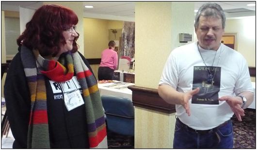 Author Stephen Pearl makes an important point (about the optimum size of a watermelon to take on a space voyage?) to an amused science fiction fan. And, isn't this what conventions are all about? Wearing a Dr. Who Scarf?