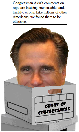 Finally! A Republican who unambiguously repudiates Todd Akin's position. Of course, Vice Presidential candidate Paul Ryan's statement would have more credibility if he hadn't sponsored two bills in Congress that limited abortions to victims of "forcible rape." You'd kind of need an electron microscope to split that hair! Or, how about the 37 other bills he sponsored that used various methods and terminology to limit abortion, many even in cases of rape?