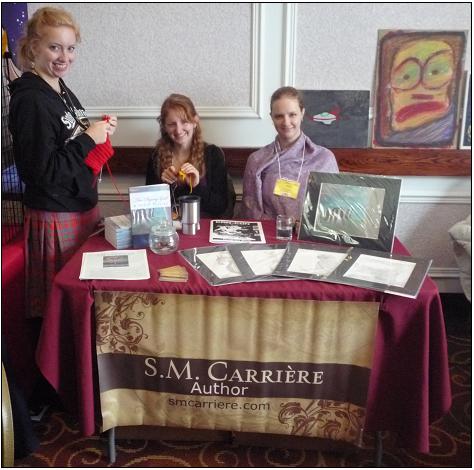 I asked S. M. Carriere if I could get a photograph of her table. I didn't have any purpose in mind; I just photograph as many things as I can at cons and find a use for as many as I can when I get home and am writing about my experience. S. M. graciously agreed. After I had taken a couple of photos, she asked if she could take a photograph of me.