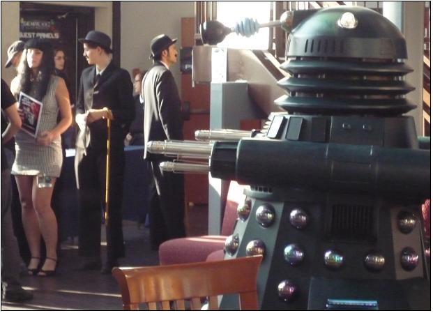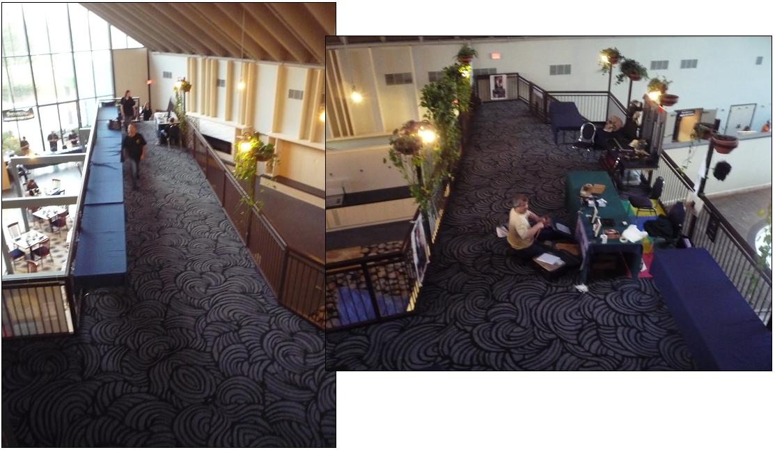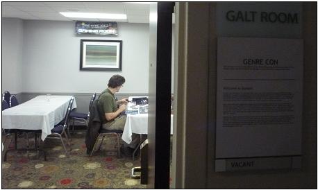 AT GENRECON: A revolving door in the programming department meant that much of the schedule was still in flux on the first day of the con. In one way, this actually worked well: on Friday, Stephen Pearl and I (but mostly Stephen) managed to get three panels onto the schedule (with the addition of J. M. Frey, they were a hoot - literally, we had to clean up the owl crap afterwards).