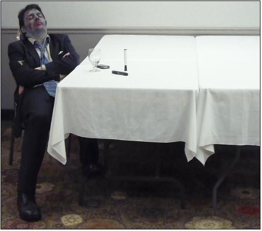 In another way, well: I asked for a time slot to do a reading. Initially, the only one that was available was five pm Sunday afternoon, the last hour of the con. I thanked them, but didn't take it; Sunday was get away day for people who were there all weekend, and I didn't expect there to be many people left. After a little juggling, a slot opened up at 10 am Sunday morning. I figured most people would be sleeping off parties at that point, but that perhaps one or two eager owlets would be up for a reading at that time.