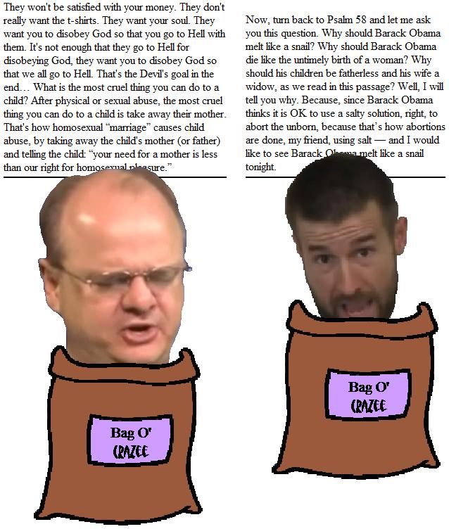 Both Klingenschmitt and Anderson are swimming in the shallow end of the soup tureen, and both use the bible as his very own Personal Crazy Justification Machine (patent pending). Honestly, I cannot choose between them. So, you go for it. If you think Klingenschmitt is a better candidate for the Bag of Crazy, tweet #GorKling. If Anderson is your choice, tweet #StephAnd. If you believe that somebody basing his personal hatred on the New Testament is less sacrilegious than pointing out that somebody is basing his personal hatred on the New Testament, feel free to text #KarlPutz.