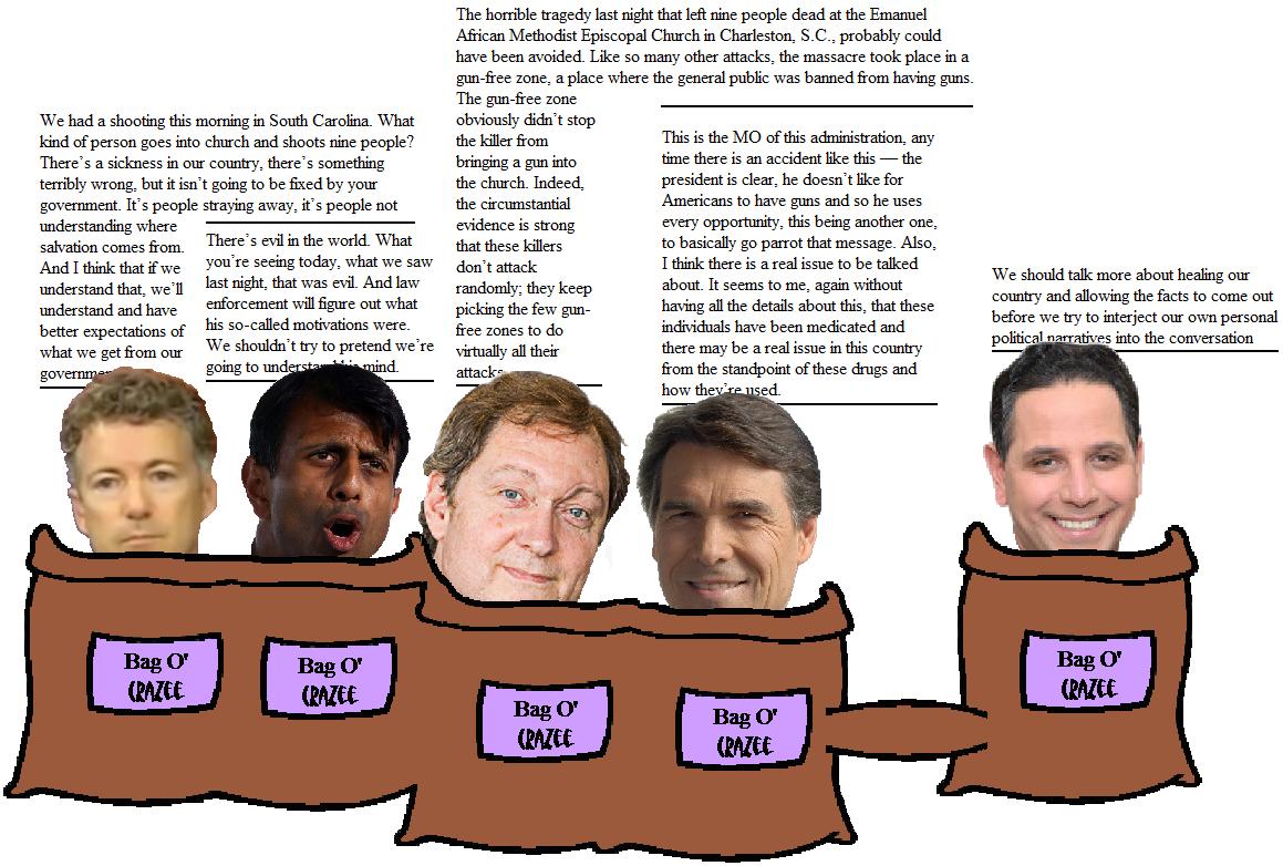 Why were seven black people shot to death in a Charleston, South Carolina church by a white man? According to Senator Rand Paul, it's because they weren't Christian enough, and, anyway, government is too big. According to Louisiana Governor Bobby Jindal, it was because the murderer was evil, and who among us can understand evil, really? According to pro-gun advocate and Fox News darling John R. Lott, they were killed in a hail of gunfire because there weren't enough guns in the church. According to Texas Governor Rick Perry, it was because the killer was high on drugs, and, anyway, the Obama administration was politicizing the incident. Republican strategist and other Fox News darling contributor Tony Sayegh, agreed: the tragedy was being used by unscrupulous people to further their own political agendas.