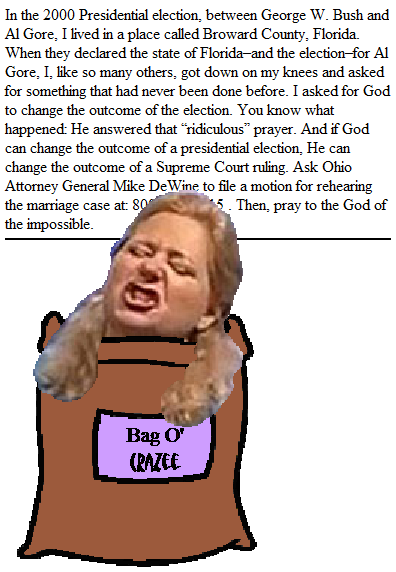 It's not like Porter is relying exclusively on god. If Ohio Attorney General Mike DeWine can be convinced to bring the case back to the Supreme Court and if it can be convinced to reconsider the case (on this, I would have said she didn't have a prayer, but under the circumstances...) Porter would insist that Justices Elena Kagan and Ruth Bader Ginsburg recuse themselves because they have presided at gay marriages. If they didn't go willingly, Porter could always ask her best bud god to rain a plague on them - nothing too nasty, mind you, just boils or locusts or something that would keep them off the bench until a new decision on gay marriage had been made.