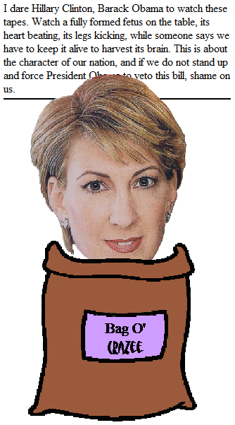 You have to feel sorry for Fiorina: as the only woman in the Republican race, she has to work twice as hard to convince primary voters that she's half as anti-woman as any of the men. (Ten times as hard as Donald Trump.) She also seems to be a woman out of time: her gruesome apocalyptic vision would have gone over big with audiences in the fifteenth century. Just think of the possibilities: she could have gotten Joan of Arc to be her running mate!