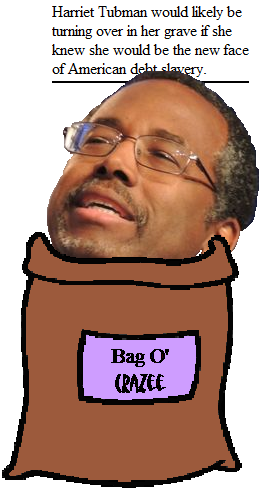 Former Republican presidential candidate Ben Carson couldn't wait to share his joy at the news that a black woman will be featured on American currency. I'm not sure how the concept of debt slavery is relevant when Alexander Hamilton, whom Tubman is displacing from the front of the $20 bill, was an owner of, you know actual human slaves. Still, it's good to know that a black Republican can be just as deserving of a chateau in the Bag of Crazy as a white one - that's an advance in racial equality, I guess.