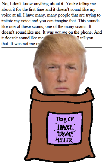 Everything is threatened when a recording from 1991 in which you identified yourself as John Miller surfaces. At the time, your Trump persona admitted to being Miller, waving the whole thing off as a joke gone awry, in order to maintain the façade. But, that was then: now, how do you let go of a joke that you've been playing on the public for over two decades, a joke that has made you ridiculously wealthy and possibly the most powerful man on the planet? You don't, of course: you respond as if the whole incident never happened.