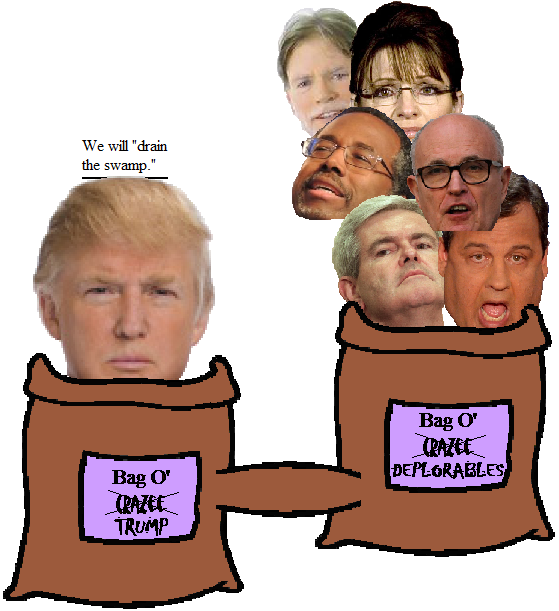 Trump's own swamp contains toads like Chris Christie and Rudy Giuliani, snakes like Newt Gingrich and David Duke, mosquitoes like Ben Carson and grizzlies far from their native habitat like Sarah Palin. Is this one of those Nixonian, "we had to drain the swamp to save the swamp" kind of moments? Because, honestly, if Trump's intention is to turn Washington into a quagmire of his own creation, we may soon learn if swamps can go bankrupt.