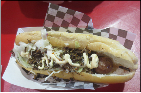 The Bug Bistro offered a limited number of dishes - probably for the best (although I am curious to know what a t-bug steak would have tasted like). I started with a hot dog that incorporated insects, as well as being liberally topped with them. I probably would have lost it if the top layer of insects was crunchy, but they were soft and went down smooth. The hot dog itself tasted like...a hot dog. No problems, there.