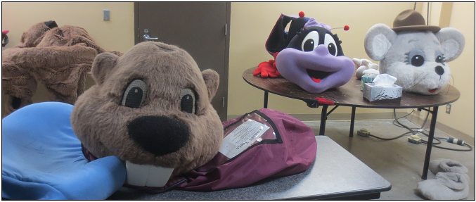 Since many of the Klingons (who weren't me) had elaborate costumes (I have a gold vest - a beginner's costume; I can't wait until the training wheels come off!), we needed a place to change. We were given space in the green room where the CNE mascots get into their costumes. Now, I know Klingons are a warrior race who are supposed to be battle hardened and all, but those oversized animal heads creeped the shit out of me!