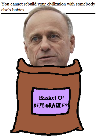King, a long-time resident of the basket of deplorables who most recently earned his place there by reducing racism to a t-shirt slogan, wanted people to know that he wasn't being racist. "It's the culture, not the blood," he explained. "If you could go anywhere in the world and adopt these little babies and put them into households that were already assimilated into America, those babies will grow up as American as any other baby." But, wouldn't that mean that you actually could rebuild your society with somebody else's babies?