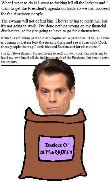 Note that Scaramucci wasn't fired because his profane attacks reflected poorly on the White House; Scaramucci is the man Donald Trump hopes to become if he ever grows up (I know, I know: given his success so far, why would he?). He was fired because an actual badass - a General - took over and wanted nothing to do with him.
