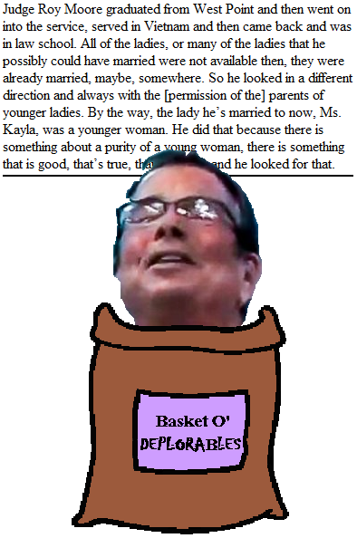 The most obvious defense of accused child molester Roy Moore would be to deny the allegations against him, but the Bible inveighs against bearing false witness, so what is a man of the cloth to do? This, apparently. You know, when Jesus said, "Suffer the children," he didn't mean to literally make them suffer by taking away the quality you claim to value most in them: their innocence.