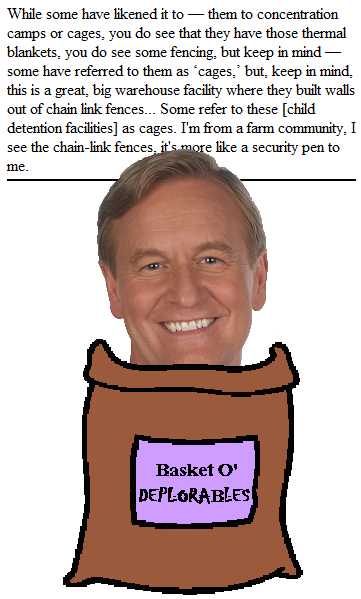 I don't know what kind of farm Fox spokesdeplorable Steve Doocy was raised on, but I'm pretty sure human beings weren't kept in security pens there. Unless, of course, it was run by Ed Gein. And, I guess Doocy isn't a wrestling fan, unless he thinks that two people going into a ring surrounded by chain link fences is called a "security pen match." And, anyway, how does comparing an enclosure that houses people to an enclosure that houses animals make the reality better‽
