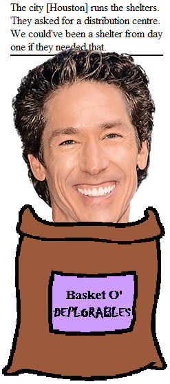 Joel Osteen wants you to know that he did not turn people away from the Lakewood megachurch, where he is Chief Pastor, after Hurricane Harvey hit; he just didn't let them in. And, it wasn't his fault: the city didn't ask him to take them in. Because, of course, Jesus waited for the Roman government to ask him to feed the multitudes before he accomplished that miracle. And, healing the lepers? Jesus wouldn't dreeeeeeaaam of doing it if the Jewish elders hadn't asked.
