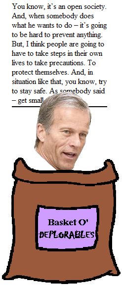 I have no doubt Thune would like to find a solution to gun violence - the fact that he voted against a bill to ban high capacity magazines over 10 bullets and for allowing firearms in checked baggage on Amtrak trains was a simple matter of...youthful exuberance? And, while residence in the basket of deplorables is often a matter of grubby self-interest, I'm certain the fact that he received at least $850,000 in campaign donation from the Nation Rifle Association in no way affected his decisi - hee hee - his deci - ha ha - de - HA HA HA HA HA!