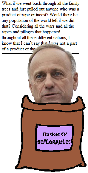 This poses a problem for most people who oppose abortion: how to justify forcing women who have been raped to carry their rapist's child to term. Fortunately for them, Representative King stuck his head out of the Basket of Deplorables long enough to shrug and say, "Hey. Rape and incest made the world what it is today. It's historical, really. You want to argue with history?"