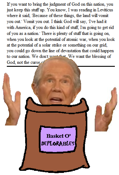 The third thing one invariably thinks when evangelist Pat Robertson speaks about gay rights is...different for very person. For me, it was: Hmm...atomic war doesn't really say "land vomiting you out" to me. The land growing a two thousand mile-long mouth and actually throwing up people by the millions, along with roast beef, mashed potatoes and a nice mixed vegetables - okay, I really don't need to paint a picture here!
