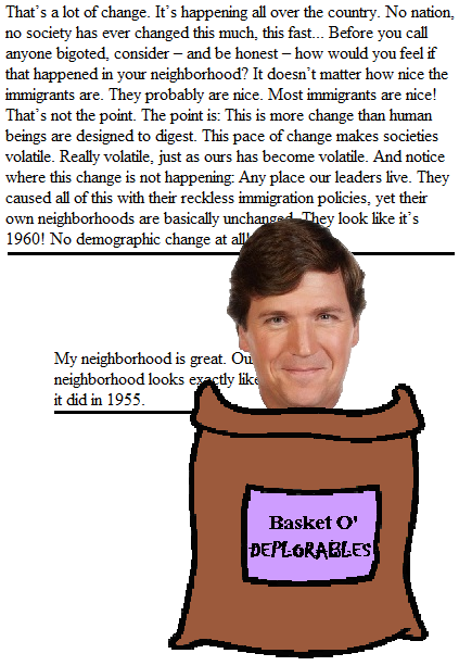 Tucker Carlson, ladies and gentlemen, a man who lives in a $3.85 million house in suburban Basket of Deplorables, circa 65 years ago, complaining of all of the other people who live in million dollar houses, circa 60 years ago. But, those five years make all the difference in responsibility for destroying the social fabric of our civilization!