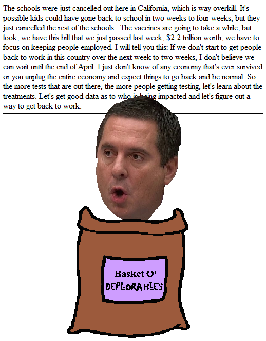 Nunes was talking about getting people back to work after President Trump had admitted that 100,000 to 200,000 Americans could die from the coronavirus. Perhaps he didn't get the memo. Perhaps he thinks he's a spy, and he ate the memo (in which case, he's a bad spy, not having read it first). Maybe he's just a horrible human being.