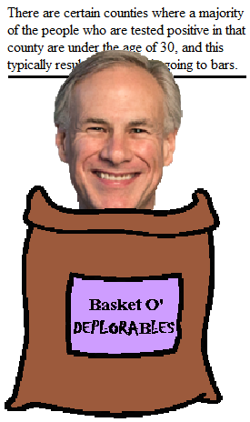In the Basket of Deplorables, there is no reality that cannot be waved away with a flick of the rhetorical tongue. (A rhetorical tongue is one you can use with a knife to eat a steak.) Where you and I may see a spike in COVID-19 infections as a public health crisis that requires a political response, Texas Governor Greg Abbott sees it as an opportunity to practice his old manism and, shaking his fist at the sky, yell at young people to get off the lawn of bars. Or, something.