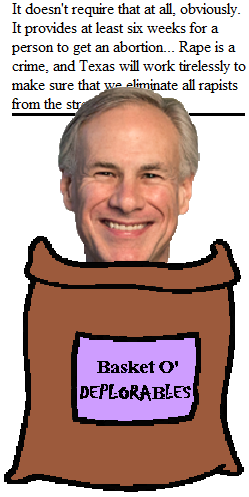 Texas Governor Greg Abbott has vowed to eliminate rape from his state. When he has successfully completed that trifle, he will move on to convincing every gun owner in the state not to use their weapons to kill anybody. Easy peasy. Once that happens, he will convince CO2 in the atmosphere to stop blocking the sun's rays, solving the problem of global climate change.