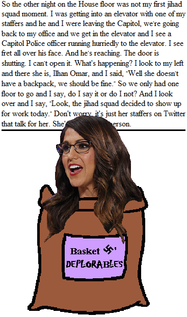 House Minority Leader Kevin McCarthy (aka: the garbage bag full of Jello that walks like a man) suggested to Boebert that she talk to Omar to work things out. Boebert agreed. Of course, her concept of "working things out" was to ask Omar why she had no sense of humour and to beg Omar not to kill her for making a joke. Omar, sensing that there would be no closure in the conversation, sensibly ended it.