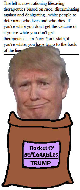 Note that Trump has gone from denying that COVID existed to admitting that it existed, but insisting that it wasn't that bad to arguing that, okay, maybe it is pretty bad, but vaccines don't work (try bleach, the quickest way to solve all your problems!) to they're keeping vaccines away from white people because...reasons. The fact that he missed a step (you know, the one where he allows that vaccines do work) is a tribute to how much he values the intelligence of members of his base.
