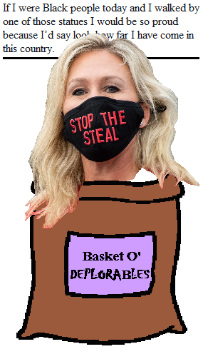 Of course, Greene knows exactly what she's talking about. When she stands in front of a statue of Robert E. Lee with members of the Aryan Nations, they always make comments like, "It's a damn good thing his side didn't win the Civil War! Black people are people, and they deserve their freedom!" and "This is a moving testament to how far black people have come in this country!"