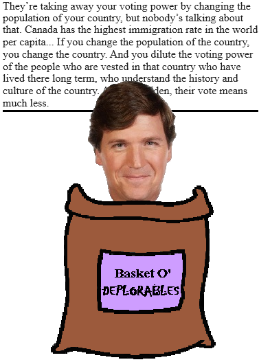 Carlson brought his Great Replacement Road Show to Alberta, where it garnered support from such Canadian luminaries as Jordan "If My Words Offend You, Your Existence Offends Me" Peterson and Conrad "Yes, I'm Still Alive - Bilious Spite Is A Remarkable Panacea" Black. And of course, Alberta Premier Danielle Smith, who wants to be Ron DeSantis without the baggage. Greg Abbott, then.