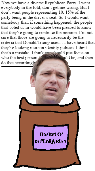Now that he is out of the race and it is of little use to him, DeSantis is gently calling out Trump's focus on identity politics. As well he should. For example, Trump's battle with Disney over its support of gay events at its theme pa - no, wait. That was DeSantis, wasn't it?